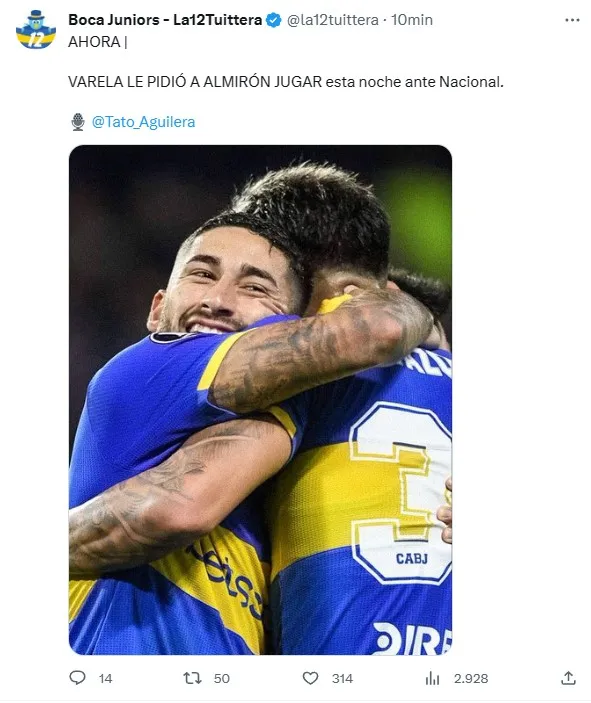 El mediocampista de Boca se marchará a Europa durante la semana y su presencia era una incógnita para enfrentar al Bolso. Sin embargo, según contó Tato Aguilera en TyC Sports, fue el propio Varela quien le pidió a Almirón poder ser titular ante Nacional para despedirse de los hinchas dentro de la cancha, sea cual sea el desenlace del Xeneize en la Copa Libertadores.