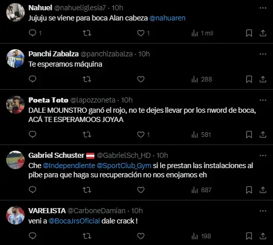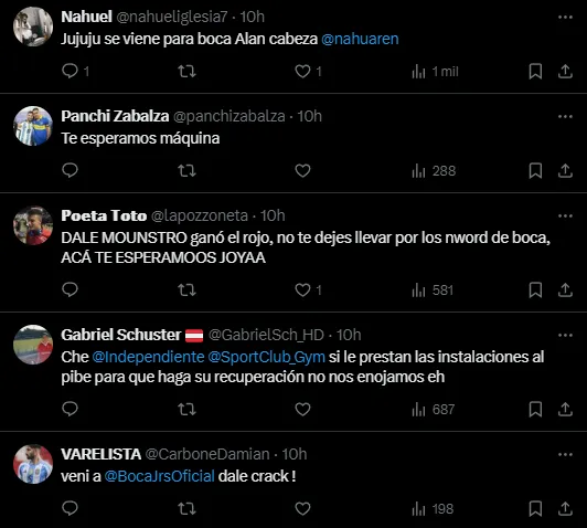Mientras en Boca esperan por una respuesta del club estadounidense a la oferta que enviaron por su pase, Alan Velasco realizó un posteo en sus redes sociales que dio que hablar tanto en los hinchas xeneizes como en los de Independiente. El volante se mostró en su cuenta de X (ex Twitter) realizando entrenamientos personales de la etapa final de la recuperación de su lesión ligamentaria y en los comentarios se llenó de fanáticos de Boca pidiéndole su arribo como refuerzo, mientras que los del Rojo se enfurecieron con la posibilidad de su llegada a Brandsen 805.