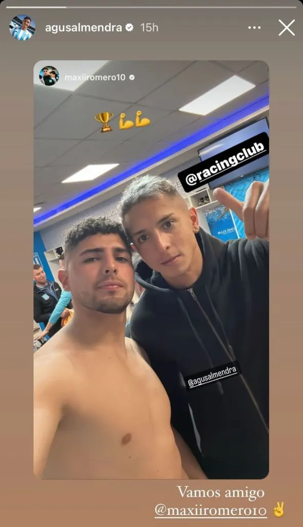 Contento por la victoria, Almendra reposteó una selfie que se tomó con Maximiliano Romero en el vestuario. “Vamos, amigo”, escribió para bancar al delantero. Sin lugar a dudas, se vienen dos partidos más que especiales para el surgido en Boca.