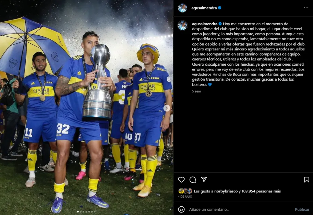 “Hoy me encuentro en el momento de despedirme del club que ha sido mi hogar, el lugar donde crecí como jugador y, lo más importante, como persona. Aunque esta despedida no es como esperaba, lamentablemente no tuve otra opción debido a varias ofertas que fueron rechazadas por el club. Quiero expresar mi más sincero agradecimiento a todos aquellos que me acompañaron en este camino: compañeros de equipo, cuerpos técnicos, utileros y todos los empleados del club . Quiero disculparme con los hinchas, ya que en ocasiones cometí errores, pero me voy de este club con los mejores recuerdos. Los verdaderos Hinchas de Boca son más importantes que cualquier gestión transitoria. De corazón, muchas gracias a todos los bosteros”