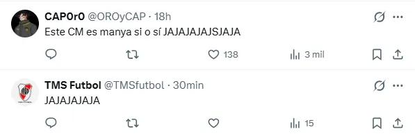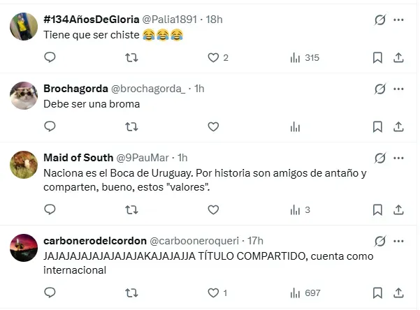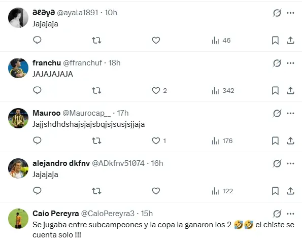 ”Felicidades por la copa que jugaban los sub campeones”, escribió el usuario GonzaEFP. Y detrás de él se sumaron otros escritos como ”Se jugaba entre subcampeones y la copa la ganaron los 2. El chiste se cuenta solo”, ”sean serios” y ”Si tenés que aclarar que era oficial, es porque era amistoso”.