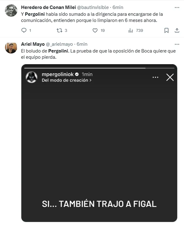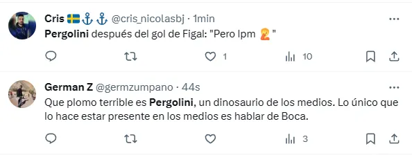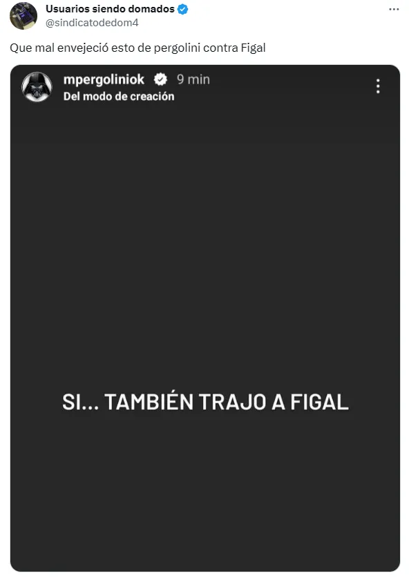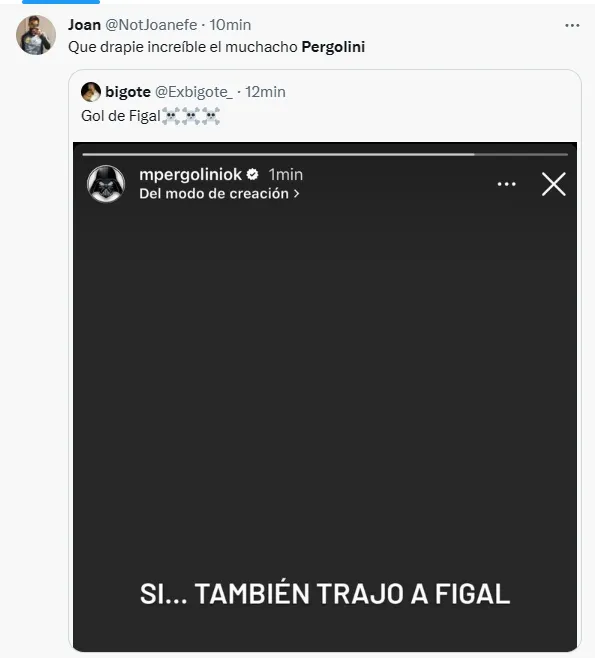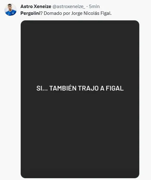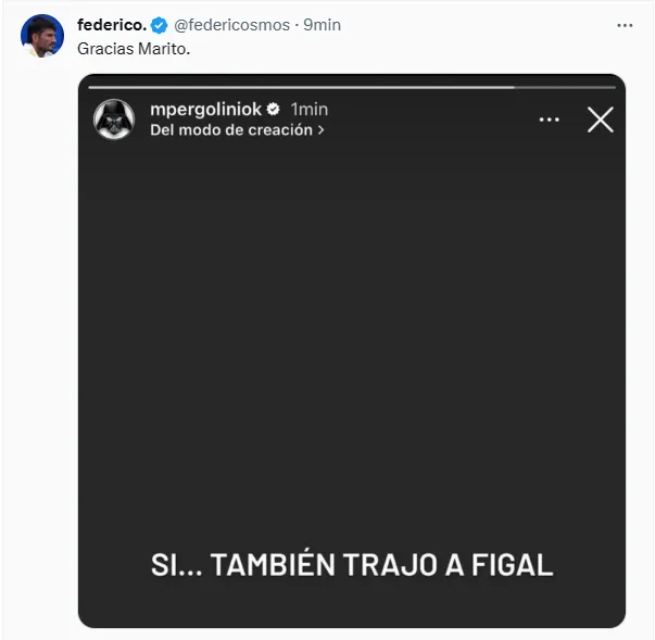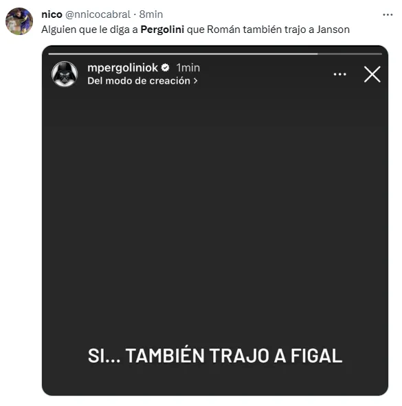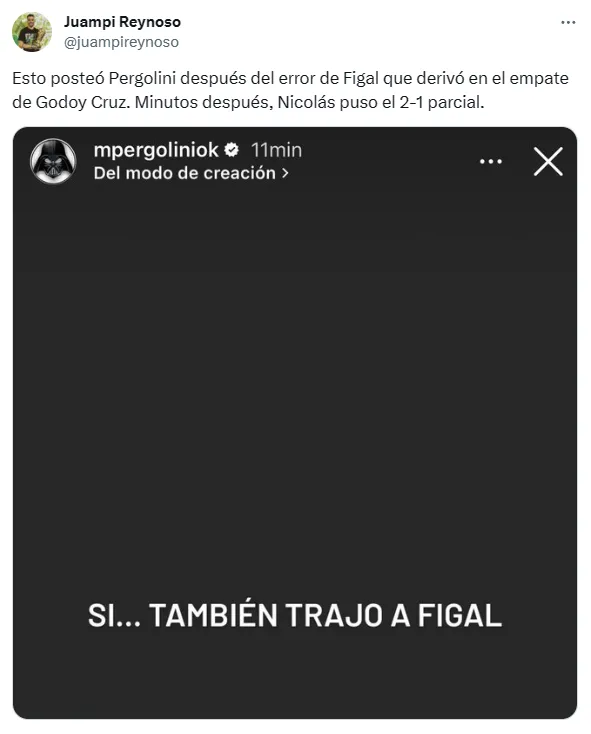 “Sí… también trajo a Figal”, escribió Pergolini a través de sus historias de Instagram. Sin embargo, el tiro le salió por la culata porque el propio Figal enmendó su error garrafal anotando el 2-1 para el Xeneize en Mendoza.