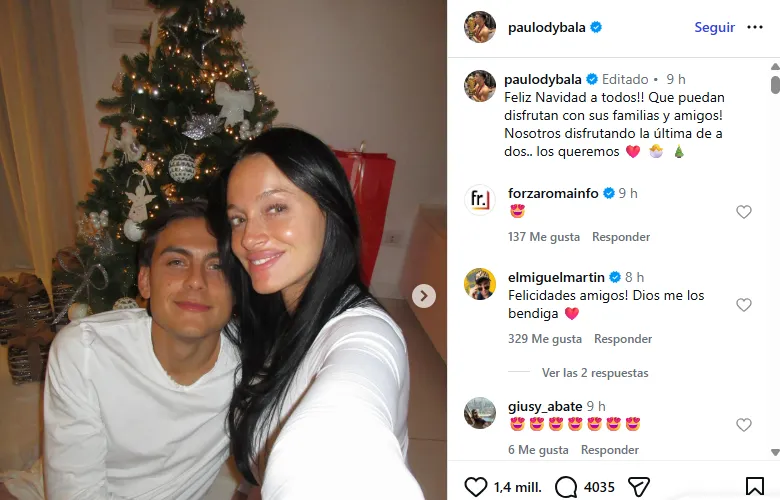 “¡Feliz Navidad a todos! Que puedan disfrutan con sus familias y amigos! Nosotros disfrutando la última de a dos… Los queremos”, escribió Dybala junto a dos fotos con Oriana Sabatini, quien espera el primer hijo de la pareja.