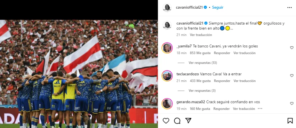 Después de varias cargadas y silbidos en Núñez, el Matador respondió en sus redes sociales con un mensaje alentador pensando en el futuro cercano de Boca. “Siempre juntos, hasta el final. Orgullosos y con la frente bien en alto”, escribió Cavani en su cuenta de Instagram.