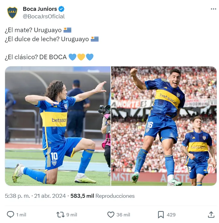 Luego de su tradicional “ganó Boca”, la cuenta oficial del Xeneize le dedicó un tuit a Edinson Cavani y Miguel Merentiel. “¿El mate? Uruguayo. ¿El dulce de leche? Uruguayo. ¿El clásico? De Boca”, soltó en club de la Ribera en ‘X’.