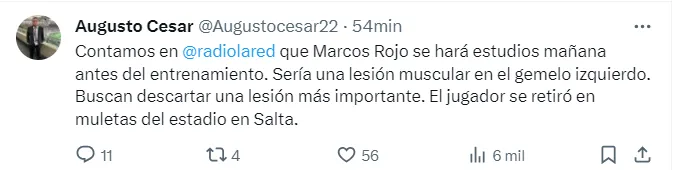 El lunes, cuando todo el plantel llegue a Boca Predio para entrenarse, Rojo se realizará los estudios médicos correspondientes para determinar el grado de la lesión. Si se confirma esta lesión muscular, serían mínimo 3 semanas afuera de las canchas. El Xeneize tendrá que ir pensando en arrancar la Copa de la Liga sin su capitán.