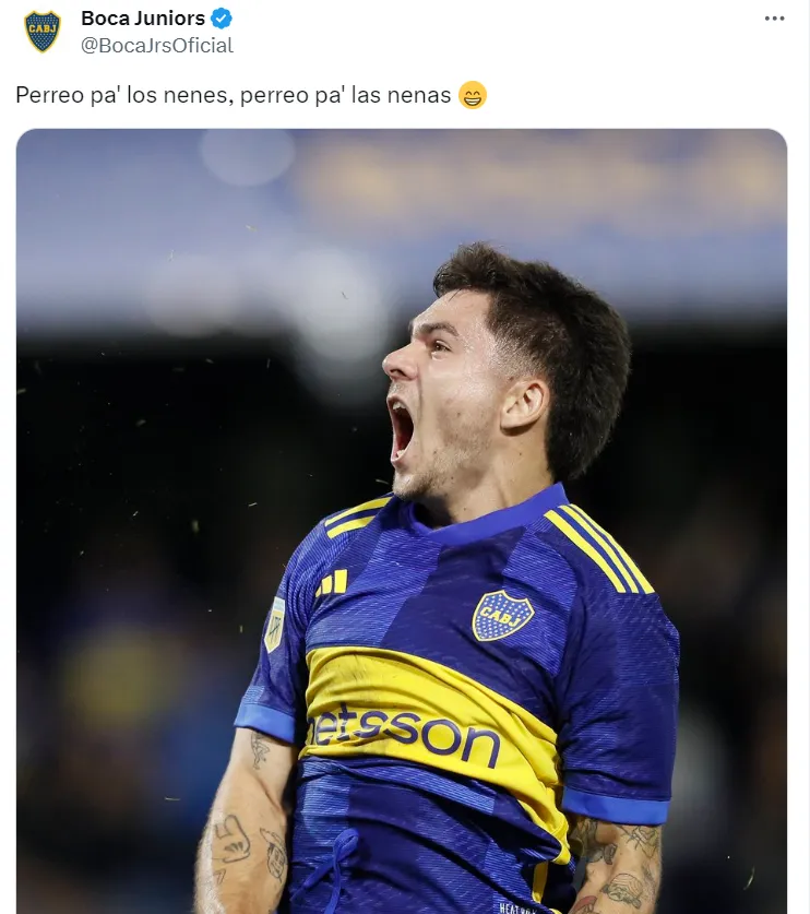 Una vez terminado el partido, Boca compartió en su cuenta de Twitter una foto de Lucas Blondel gritando el gol acompañado de la letra de una canción: “Perreo pa´ los nenes, perreo pa´ las nenas”. La canción en cuestión es Baila Morena de Héctor & Tito. Se sabe que el lateral del Xeneize está en pareja con Morena Beltrán, la periodista de ESPN.