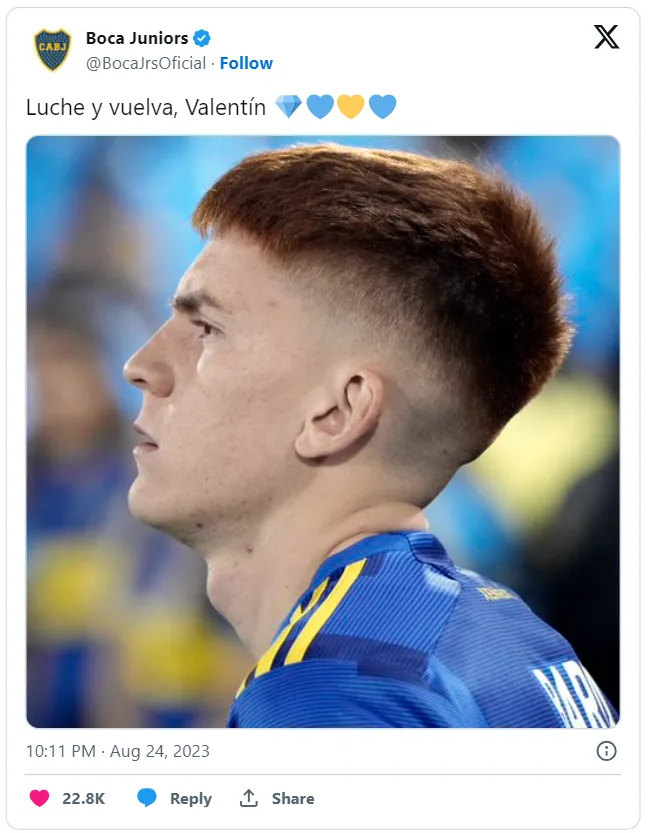 Cuando se confirmó que Barco hará el esfuerzo para recuperarse, la cuenta oficial de Boca subió una foto suya y escribió: “Luche y vuelva, Valentín”. Al cabo de pocos minutos, la imagen tenía miles de interacciones. Todos sueñan con que el zurdo esté disponible.