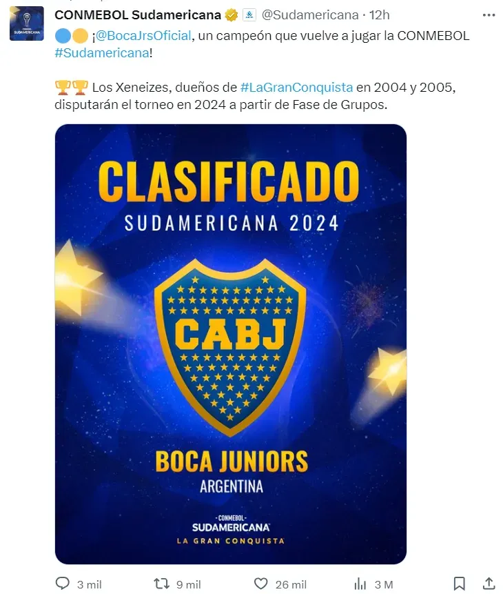 “¡Boca Juniors, un campeón que vuelve a jugar la CONMEBOL Sudamericana! Los Xeneizes, dueños de la gran conquista en 2004 y 2005, disputarán el torneo en 2024 a partir de Fase de Grupos”, soltó @Sudamericana en sus redes, acompañando una placa que dice “Boca Juniors, clasificado”.