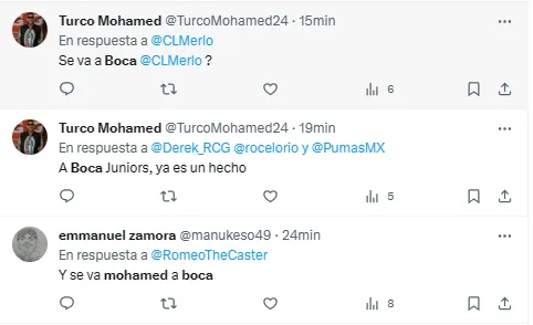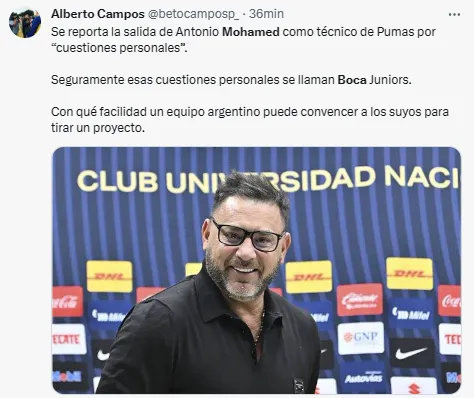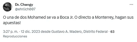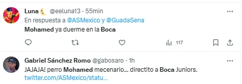 “Se va a Boca”, fue uno de los comentarios más leídos tras conocerse la renuncia de Mohamed en México. Otro de los tuits que aparecieron decía: “Ahora si será una sorpresa ver en 15 días a Mohamed en Monterrey o Boca y haciéndolos campeones”. No fue buena la reacción.