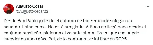 En adición, el periodista Augusto César aclaró que, si bien a Boca no le llegó ninguna oferta por el mediocampista, el acuerdo del Tricolor con el jugador es inminente y esto desembocará en la propuesta económica que llegará a las oficinas de la Bombonera, siempre y cuando desde el lado de Fernández esté el visto bueno.