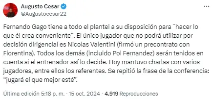 Según adelantó Augusto César, Gago solamente tiene una restricción con respecto a la selección de jugadores al no poder citar a Nicolás Valentini.