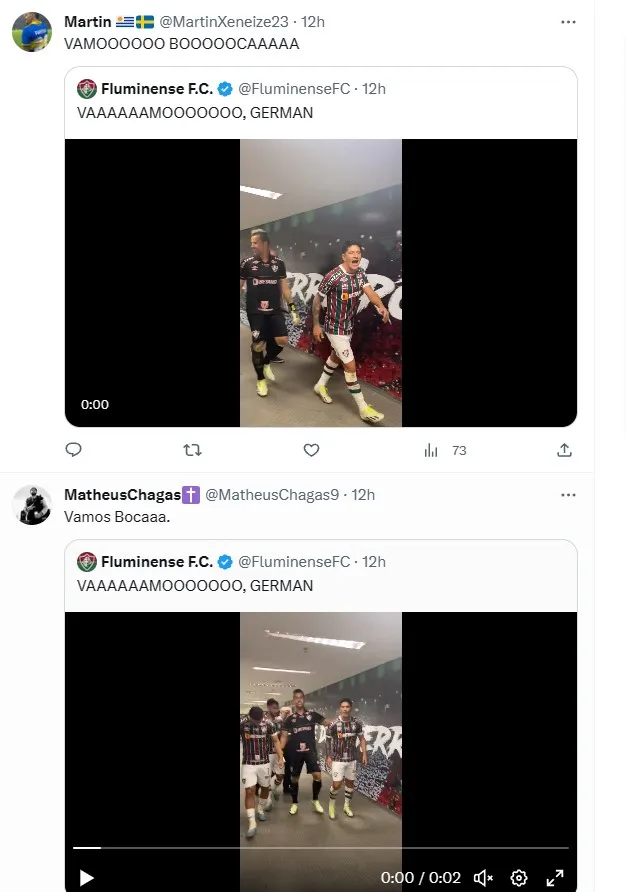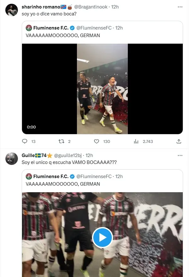 Es por eso que, terminado el encuentro, los jugadores de Fluminense salieron gritando por los pasillos y un video de Germán Cano se viralizó en ese momento, luego de que se escuchara su aullido. “Vamos Boca”, es lo que parece decir el goleador del Tricolor mientras celebra junto a sus compañeros, aunque lo que intentó vociferar es “¡vamos porra!”, grito de guerra en portugués.