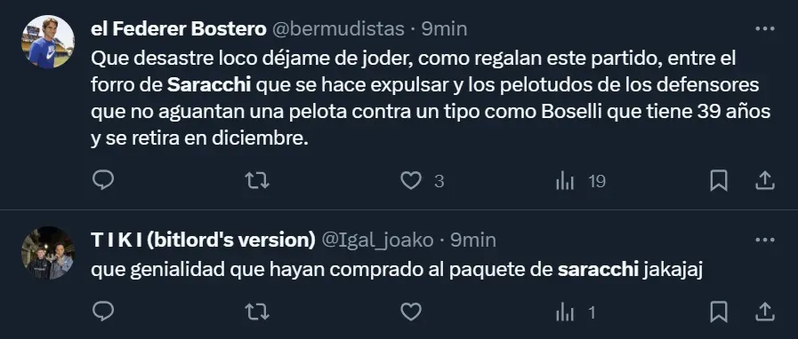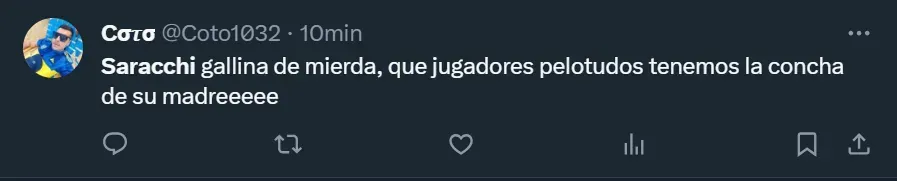 El mayor apuntado por los fanáticos del Xeneize fue Marcelo Saracchi, a quien responsabilizaron por su expulsión en la primera etapa, cuando solamente transcurrían 14 minutos del encuentro. Incluso, uno de los tantos usuarios de X, la red social anteriormente conocida como Twitter, también aprovechó el momento para criticar a Frank Fabra.