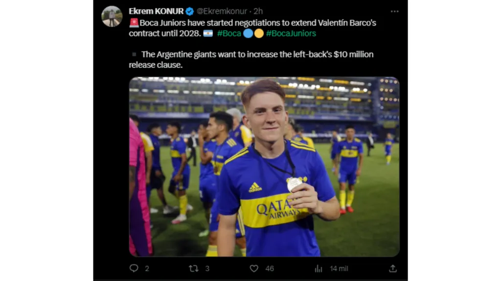El periodista Ekrem Konur en su cuenta de Twitter expresó que las negociaciones entre el club de la Ribera y Valentín Barco ya empezaron y que la intención principal es que acepte una renovación hasta 2028. Además, el jornalista especializado en mercado de pases comentó que otro énfasis de Boca es efectivamente subirle la cláusula de rescisión actual, la cual es de 10 millones de euros.