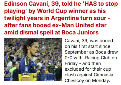 En esa misma línea, Daily Mail también se hizo eco de las declaraciones de Oscar Ruggeri, que en ESPN, palabras más, palabras menos, le recomendó a Cavani que se retire. ”Juega un poco, quizá falla un gol, y veo a algunos que se ríen, otros se burlan de él y creo que es tan grande que tiene que tomar la decisión él mismo, no nosotros. Tiene que decidir que si su cuerpo no aguanta más, no puede más. La carrera que tuvo, ¿qué más le va a dar? Dice que no puede más. No tiene deudas. Vino, lo intentó, pero físicamente no pudo”, fue la cita del medio a raíz de lo que opinó el Cabezón.