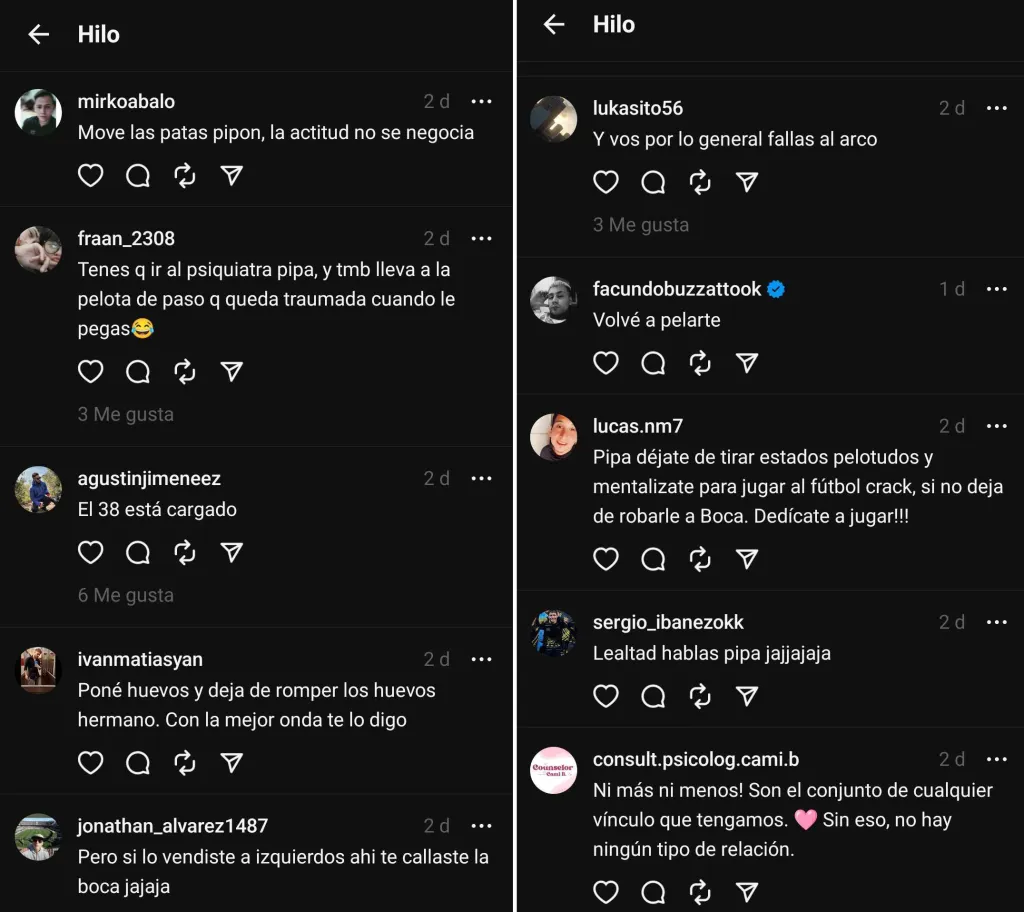 “Confianza, lealtad y respeto. Fallás en una, perdés las 3”, escribió el atacante en Threads, la nueva red social vinculada con Instagram. Varios simpatizantes aprovecharon para contestarle al Pipa. Algunos optaron por bancarlo y muchos otros no…