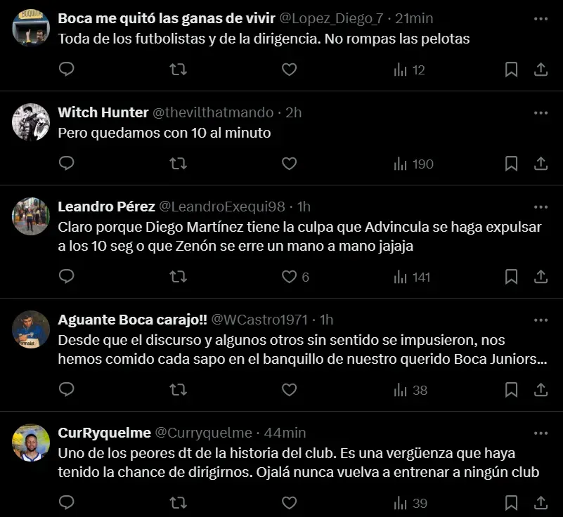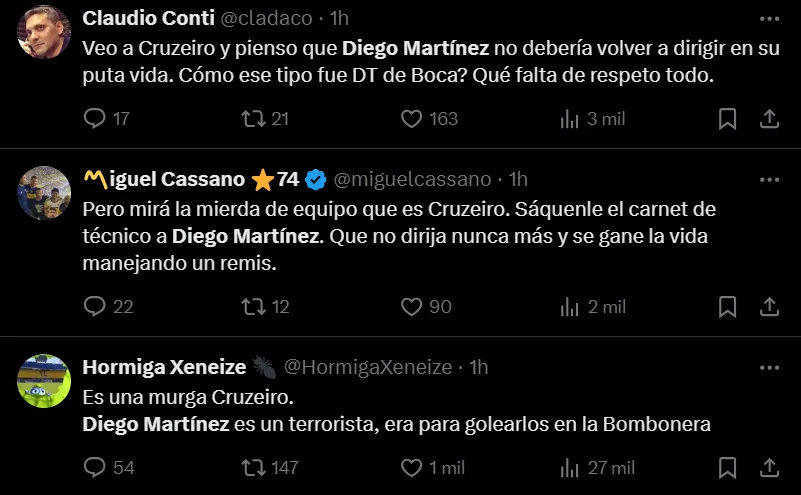 Por ese motivo, el nombre de Diego Martínez fue tendencia en las redes sociales durante el desarrollo de la final del certamen internacional debido a que Boca quedó en el camino ante el subcampeón. Diversos hinchas xeneizes le cayeron al ex DT con comentarios como “mirá lo que es Cruzeiro, saquenle el carnet de técnico a Martínez”.