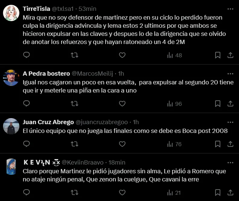 Incluso, otros hinchas saltaron en defensa del “Gigoló“, alegando que hizo un buen labor y se condicionó el pase a cuartos de final por la expulsión de Advíncula y el penal errado de Miguel Merentiel. Para bien o para mal, el nombre de Martínez fue tendencia en la consagración de Racing ante Cruzeiro en la final de la Copa Sudamericana.