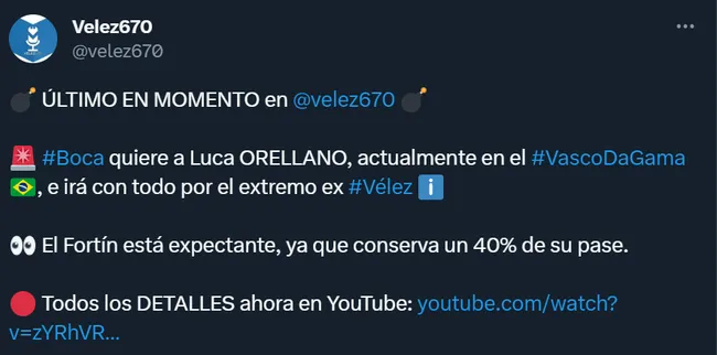 El ex futbolista de Vélez Sarsfield se encuentra en Brasil desde principios del 2023, y tiene contrato en Rio de Janeiro hasta diciembre del 2025. Quien confirmó la operación que está llevando a cabo Riquelme fue el programa partidario Vélez670, dado a que el elenco de Liniers aún posee un 40% de la ficha del extremo de 23 años.
