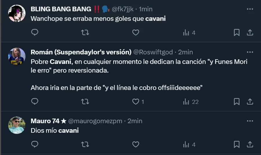 “Lo de Cavani es inentendible”, fue uno de los tantos comentarios que surgieron desde las tribunas virtuales, donde aquellos hinchas que no pudieron concurrir al estadio Pedro Bidegain se quejaron de la actuación del ex atacante de Manchester United, Napoli y Paris Saint-Germain.