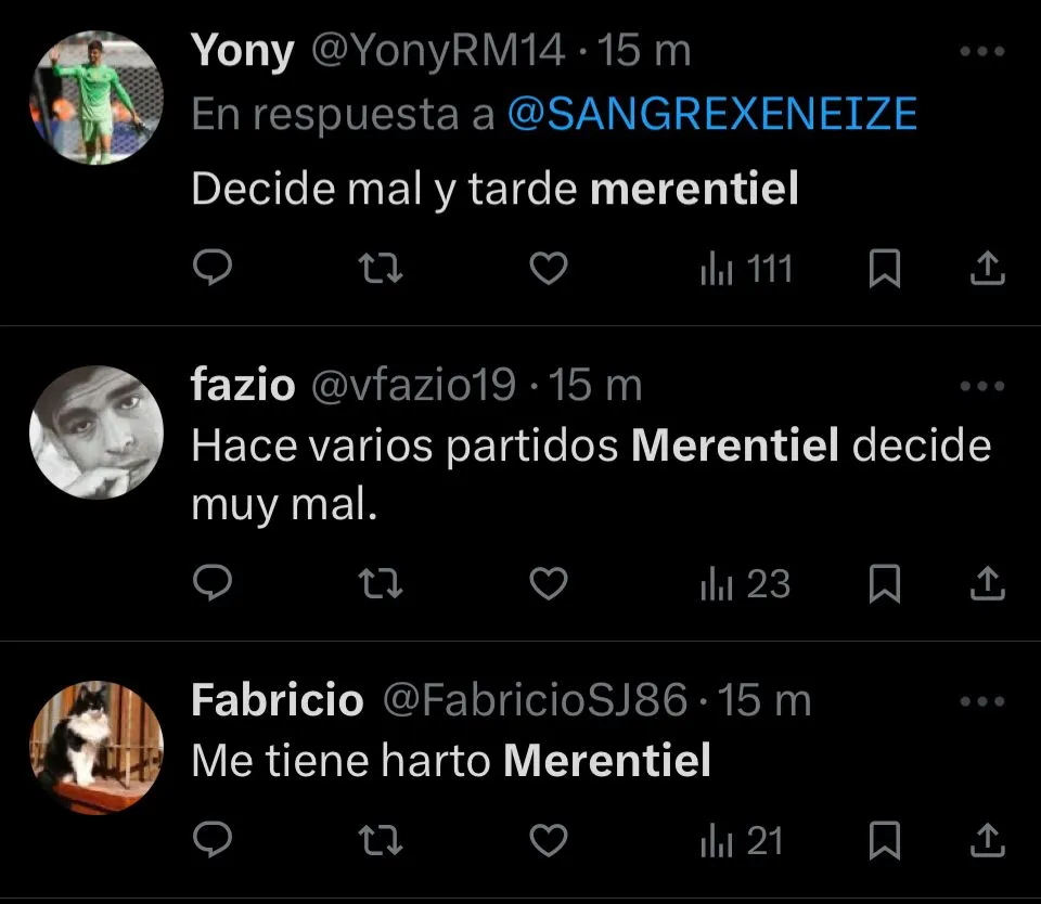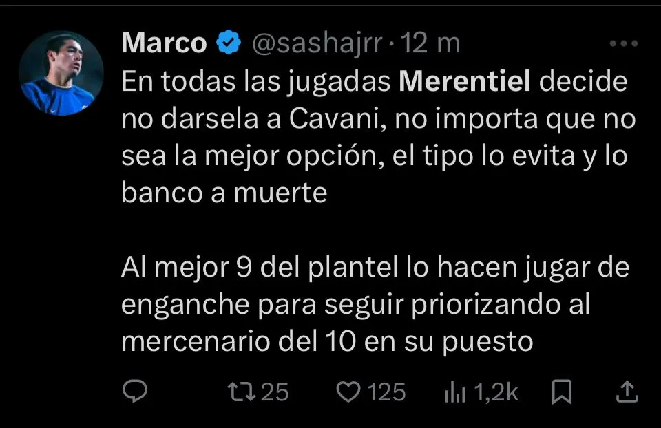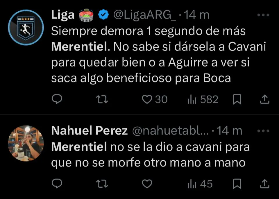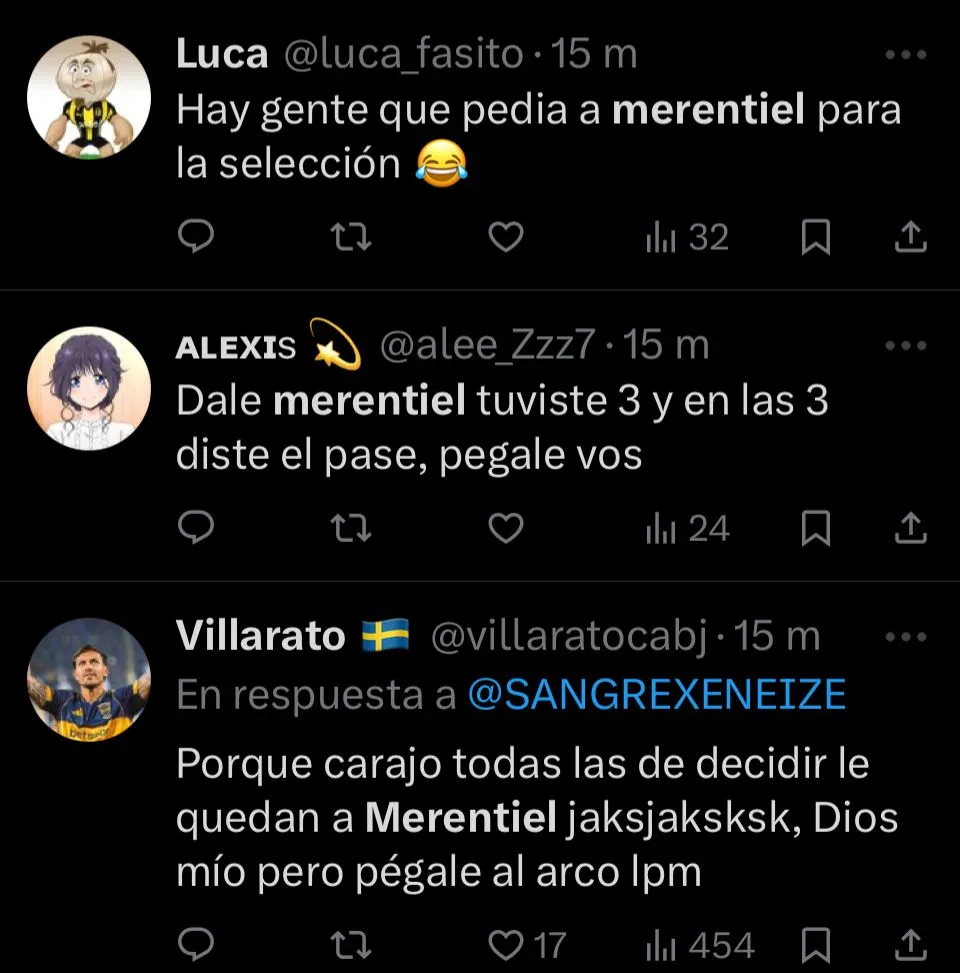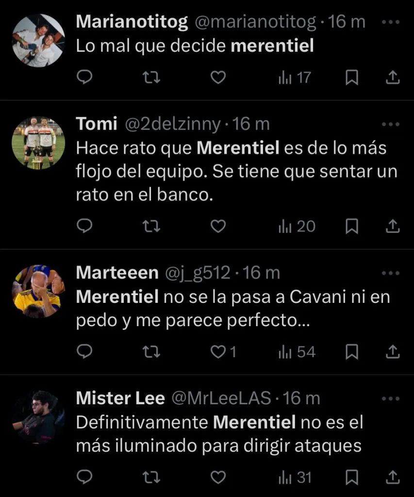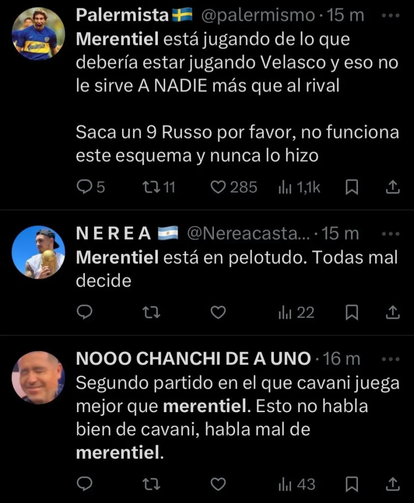 Ante la ausencia de hinchas visitantes en el José María Minella, el público xeneize se expresó a través de redes sociales. Y así como celebraron los goles de Lautaro Di Lollo y Rodrigo Battaglia, tampoco anduvieron con medias tintas para cuestionar a Miguel Merentiel. El uruguayo abandonó la cancha a los 22 minutos del segundo tiempo luego de no lograr aprovechar ciertos contraataques que podrían haber colaborado en el marcador.
