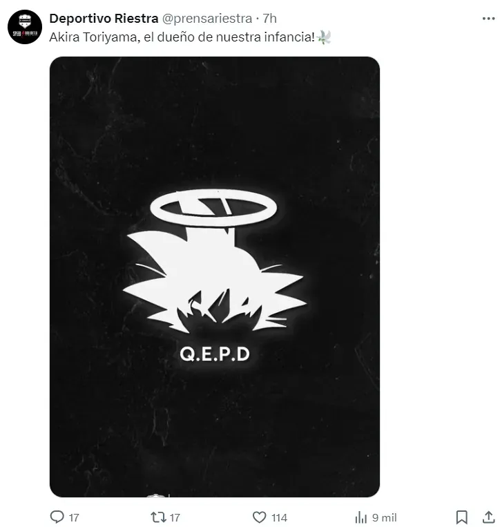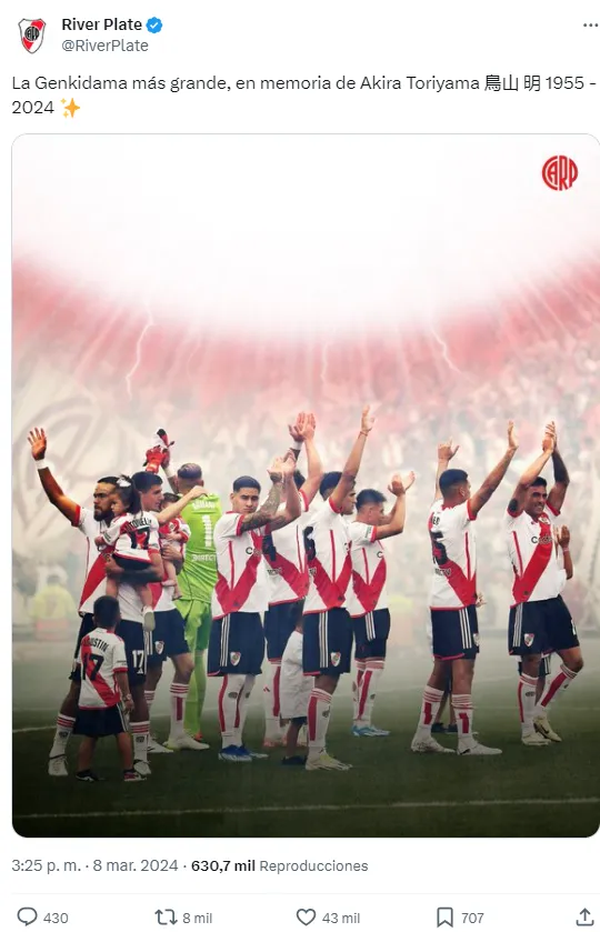 Horas atrás, River también le había dedicado un posteo a Akira Toriyama, pero con la frase “La Genkidama más grande, en memoria de Akira Toriyama 鳥山 明 1955 – 2024”.