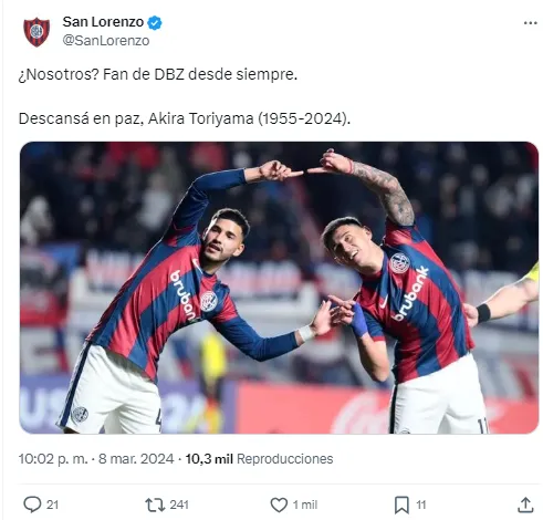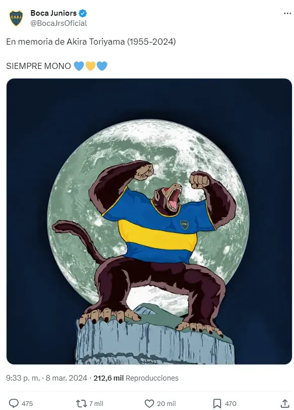 “En memoria de Akira Toriyama (1955-2024). Siempre mono“, escribió el Xeneize, haciendo referencia a la frase que se completa con un “nunca sapo” y es muy utilizada por los hinchas. Por supuesto, el mensaje fue acompañado por un dibujo que recibió la aprobación de los simpatizantes.