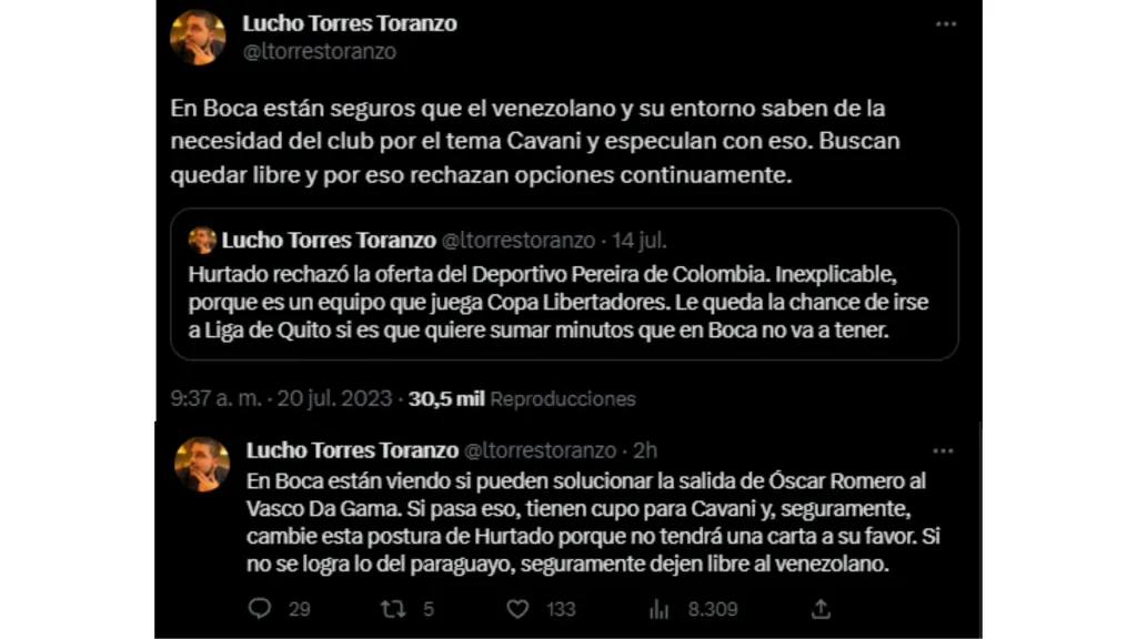 “En Boca están seguros que el venezolano y su entorno saben de la necesidad del club por el tema Cavani y especulan con eso. Buscan quedar libre y por eso rechazan opciones continuamente”, señaló el jornalista en su cuenta de Twitter. Ante esta postura del venezolano respecto a su futuro, en el club de la Ribera planean tomar una decisión tajante con el mercado de pases y con Hurtado en sí.