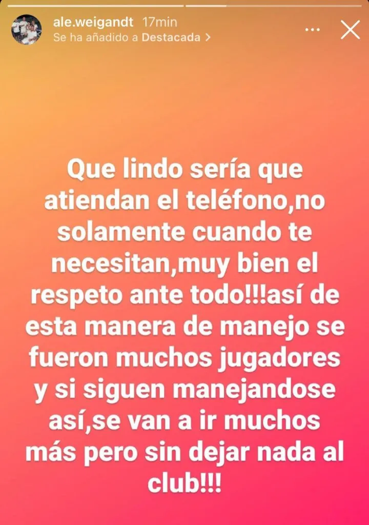 “Todo lo malo vuelve, no entiendo como no dejan crecer a un jugador en el que en dos meses quedaría libre. O sea, que prefieren perder dinero y decir lo más fácil siempre, que es echarle la culpa al jugador, que es mercenario. Lo mismo de siempre, muy bien se manejan”, escribió Alejandro Weigandt en su cuenta de Instagram para disparar contra la dirigencia de Boca que comanda Riquelme.