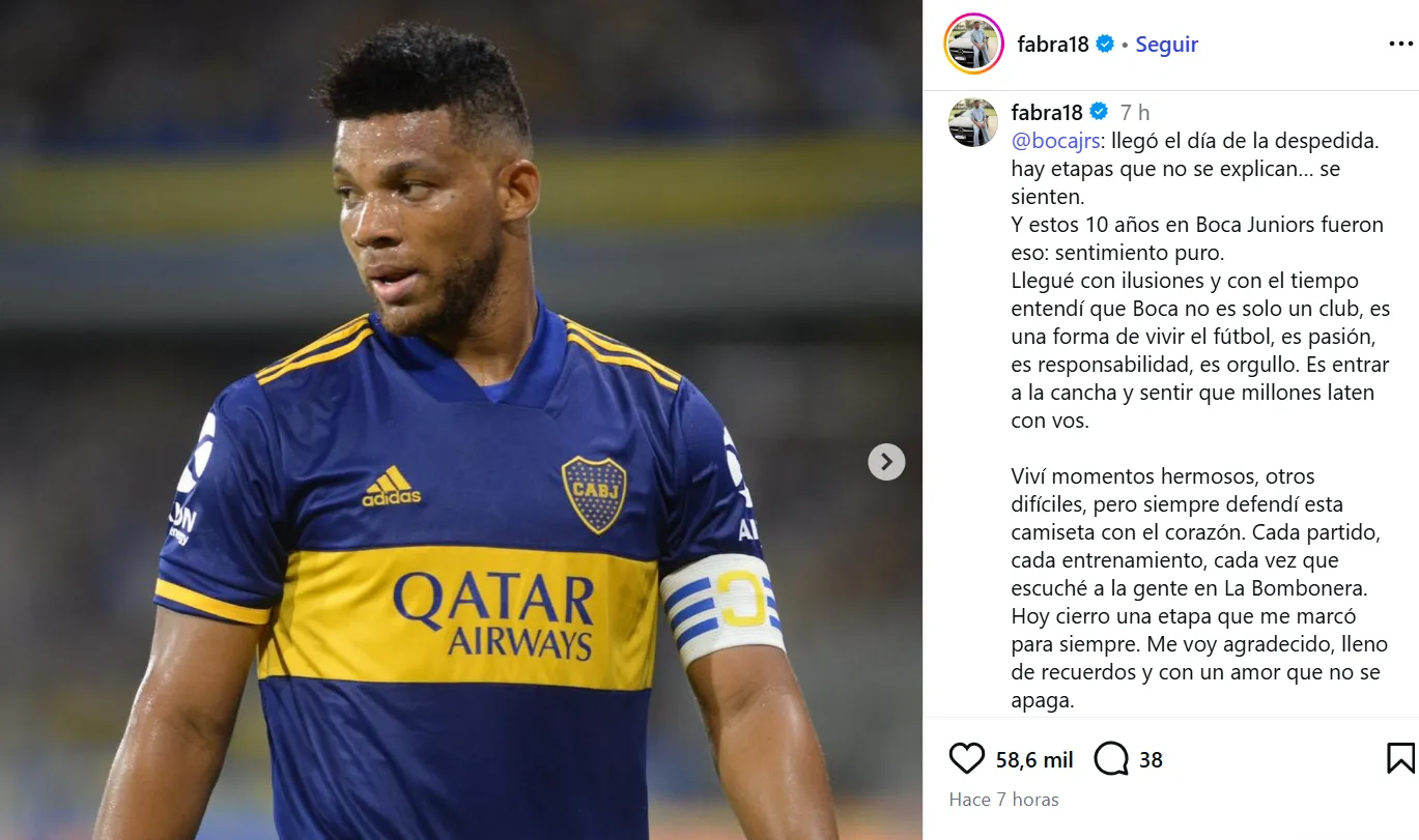A través de su cuenta de Instagram, Frank Fabra publicó un emotivo mensaje de despedida acompañado de varias fotos: “Llegó el día de la despedida. hay etapas que no se explican… se sienten. Y estos 10 años en Boca Juniors fueron eso: sentimiento puro. Llegué con ilusiones y con el tiempo entendí que Boca no es solo un club, es una forma de vivir el fútbol, es pasión, es responsabilidad, es orgullo. Es entrar a la cancha y sentir que millones laten con vos”.