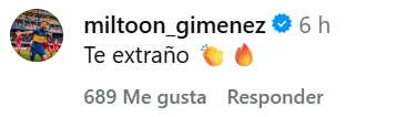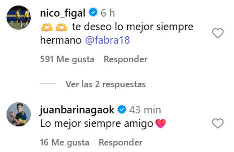En la publicación de Fabra -que tiene limitados los comentarios- solamente tres jugadores del actual plantel de Boca le comentaron. Nicolás Figal escribió: “Te deseo lo mejor siempre, hermano”. Juan Barinaga aportó: “Lo mejor siempre amigo”, mientras que Milton Giménez publicó: “Te extraño”.