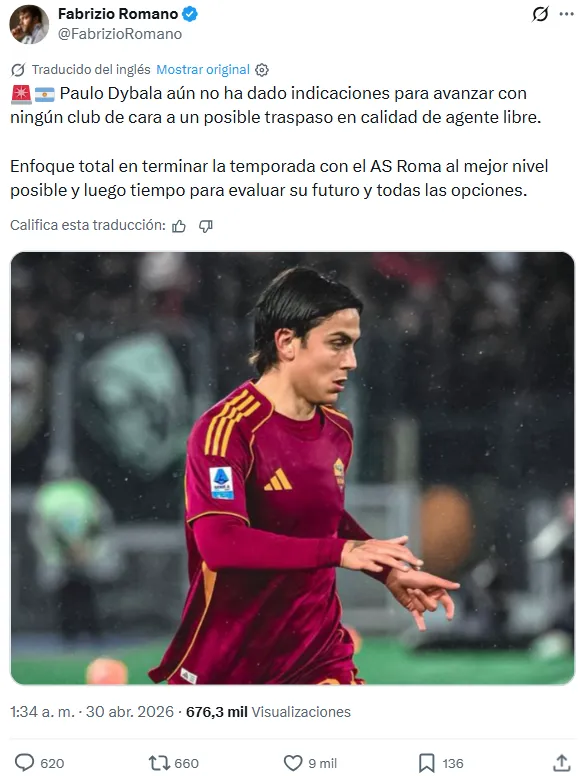 Paulo Dybala aún no ha dado indicaciones para avanzar con ningún club de cara a un posible traspaso en calidad de agente libre“, aseguró Romano, desmintiendo los rumores que indicaban que el campeón del mundo ya tenía arreglado su arribo al equipo de la Ribera.