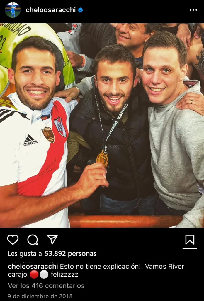 “¡Esto no tiene explicación! ¡Vamos River carajo! Feliz”, son las palabras que compartió el uruguayo aquel 9/12, en un posteo que nunca borró de su Instagram y que se mantiene en su perfil. En la imagen se lo ve con la medalla de campeón colgada, abrazado con su compatriota Camilo Mayada.