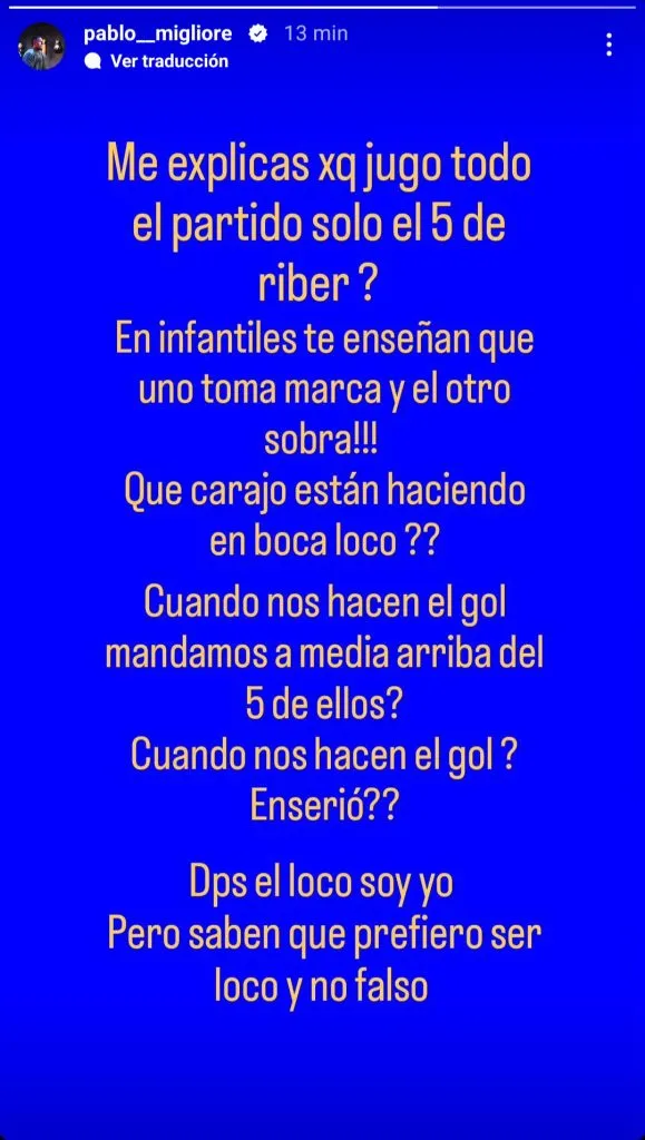 A través de una storie en Instagram, Migliore apuntó indirectamente contra Martínez, pero también contra Juan Román Riquelme, con quien está enemistado y con el que ya ha tenido algún cruce: “¿Me explicás por qué jugó todo el partido solo el 5 de River? En infantiles te enseñan que uno toma marca y el otro sobra. ¿Qué carajo están haciendo en Boca, loco? Cuando nos hacen el gol, ¿mandamos a Medina arriba del 5 de ellos? ¿En serio? Después el loco soy yo, pero saben que prefiero ser loco y no falso”, explayó.