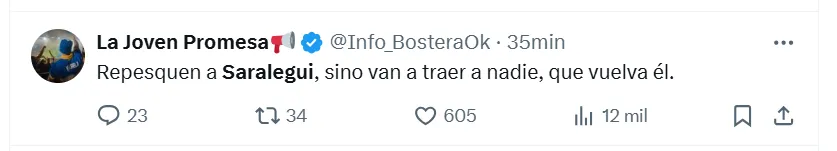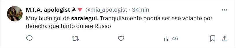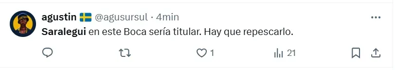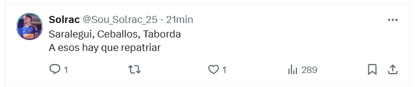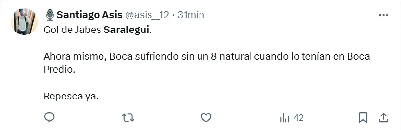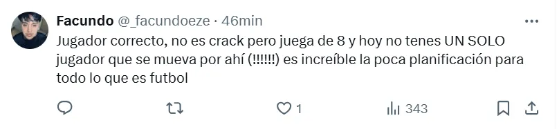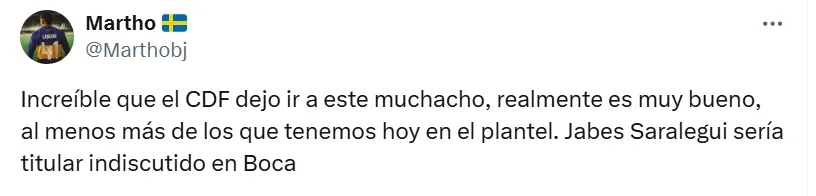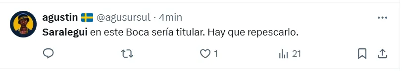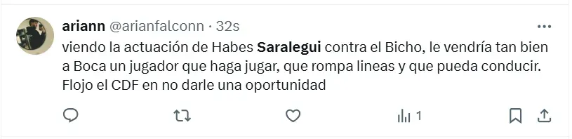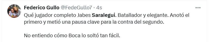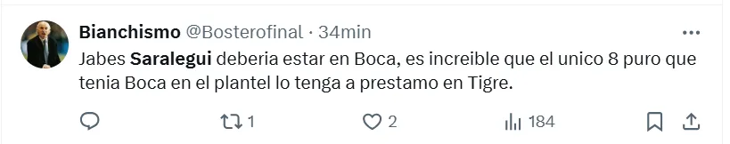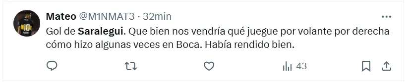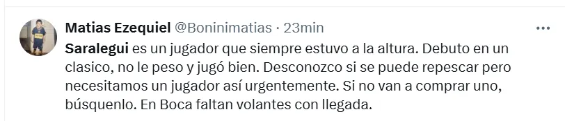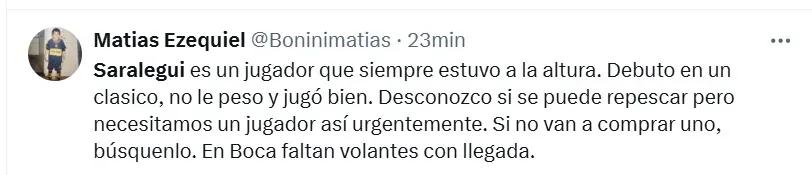 Algunos de los posteos que más resaltaron fueron los siguientes: “Hay que repescarlo”, “es el jugador que necesita Boca”, “había rendido bien”, “siempre estuvo a la altura”, “hay que cortar el préstamo”, “tranquilamente podría ser ese volante por derecha que tanto quiere Russo”, “batallador y elegante”, “que vuelva” y “realmente es muy bueno“.