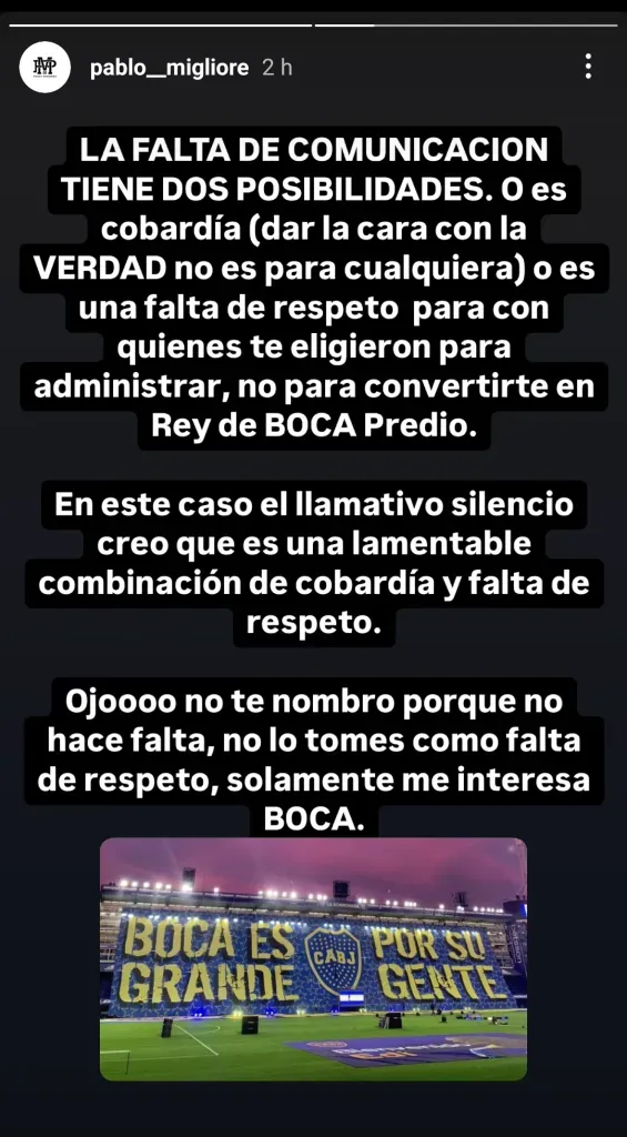 Pasaron las horas y el campeón de la Copa Libertadores 2007 volvió a atacar por la misma vía: “La falta de comunicación tiene dos posibilidades. O es cobardía (dar la cara con la verdad no es para cualquiera) o es una falta de respeto para con quiénes te eligieron para administrar, no para convertirte en el Rey de Boca Predio. En este caso el llamativo silencio creo que es una lamentable combinación de cobardía y falta de respeto. Ojo. No te nombro porque no hace falta. No lo tomes como falta de respeto. Solamente me interesa Boca”.