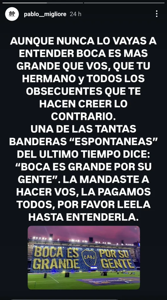 “Aunque nunca lo vayas a entender, Boca es más grande que vos, que tu hermano y todos los obsecuentes que te hacen creer lo contrario. Una de las tantas banderas ‘espontáneas’ del último tiempo dice: ‘Boca es grande por su gente’. La mandaste a hacer vos, la pagamos todos. Por favor, leela hasta entenderla”, disparó primero Migliore durante la noche del domingo.