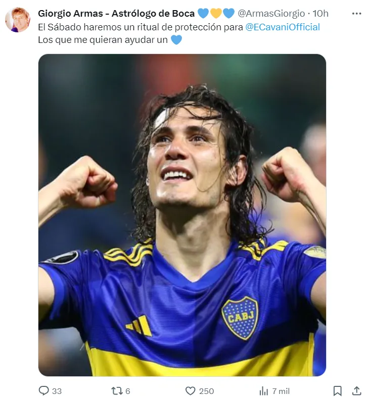 “El sábado haremos un ritual de protección para Edinson Cavani”, reveló el astrólogo, que invitó a sus seguidores a darle una mano. El objetivo es que el uruguayo vuelva a ser el que fue a buscar Boca, que es nada más ni nada menos que uno de los máximos goleadores del mundo en actividad.