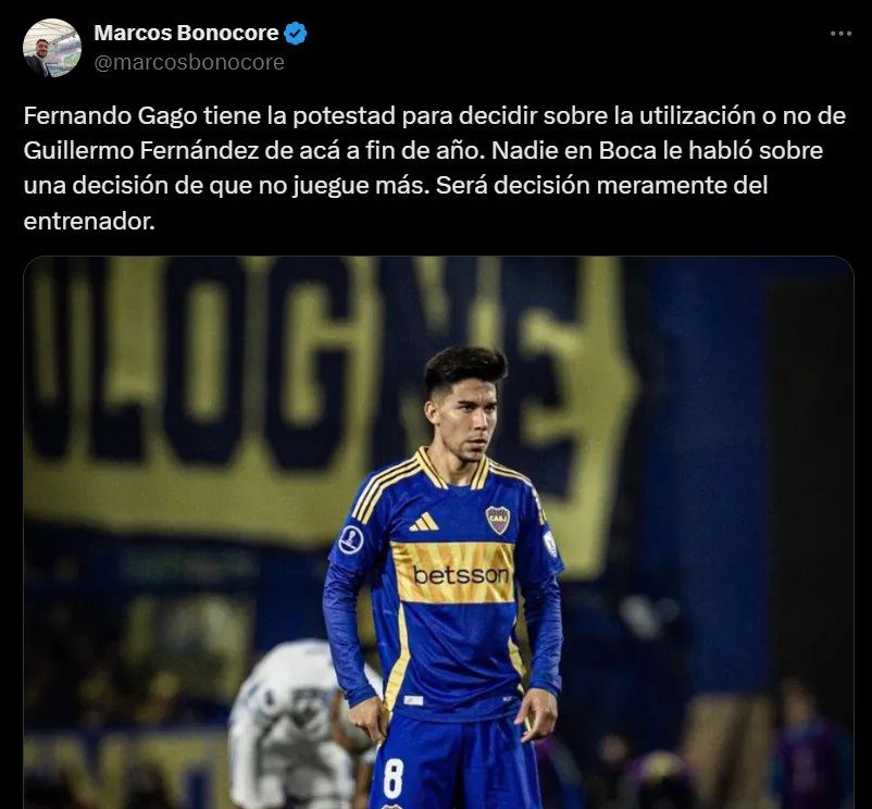 En base a esto, el periodista Marcos Bonocore sumó: “Fernando Gago tiene la potestad para decidir sobre la utilización o no de Guillermo Fernández de acá a fin de año. Nadie en Boca le habló sobre una decisión de que no juegue más. Será decisión meramente del entrenador“. Así, se confirma que lo que se decida sobre los futbolistas del plantel estará plenamente realizado por postura del DT.