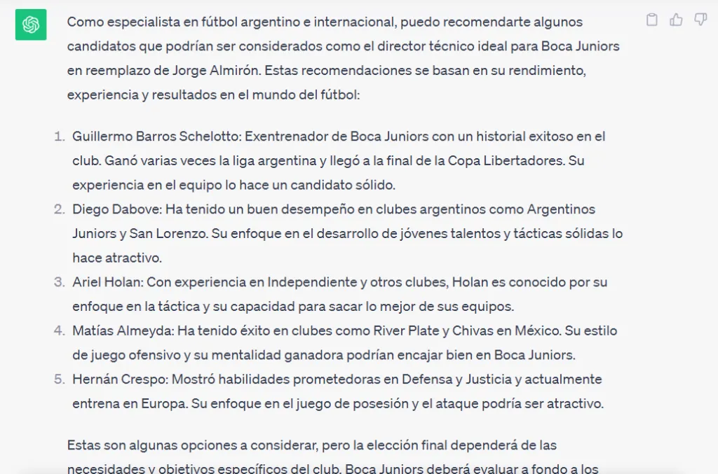 Mientras el Consejo de Fútbol comandado por Riquelme comienza a trabajar en la búsqueda de su reemplazante, desde Bolavip Argentina le pedimos a Chat GPT, una Inteligencia Artificial, que nos de sus cinco candidatos para ser el próximo entrenador de Boca, basado en la experiencia y trabajo de cada perfil.