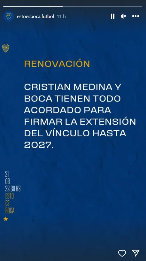 “Cristian Medina y Boca tienen todo acordado para firmar la extensión del vínculo hasta 2027”, comunicó el club. Si bien la finalización del vínculo no estaba cerca, probablemente tenga que ver con una importante mejora salarial para el jugador y una actualización en la cláusula de rescisión.