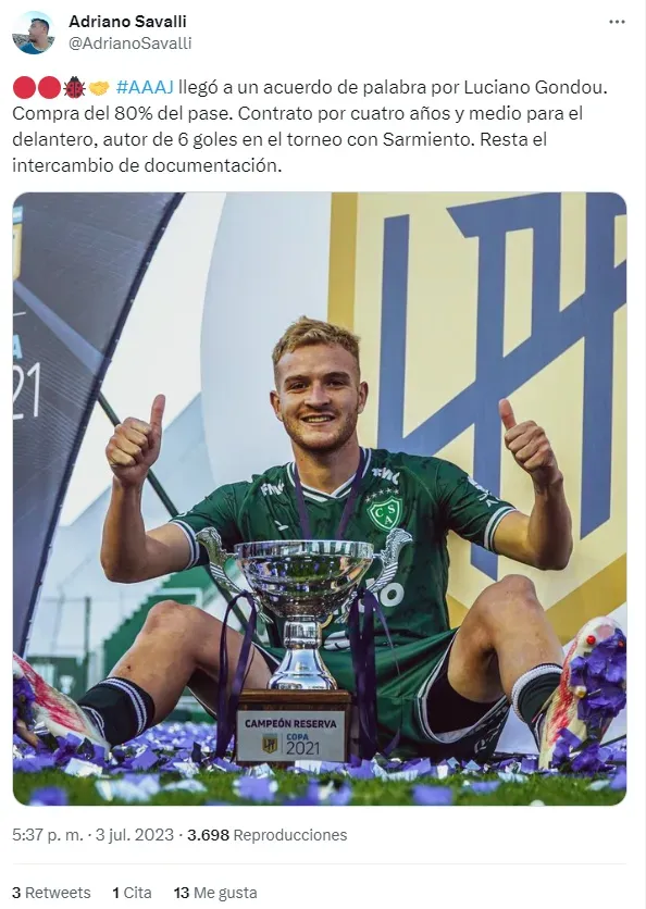 El Verde llegó a un acuerdo con Argentinos Juniors, que comprará el 80% del pase de Gondou. Solo restan detalles para que la gran figura del conjunto de Junín firme su contrato por cuatro años y medio (hasta diciembre de 2027) y juegue la Libertadores para el Bicho.