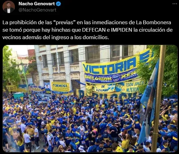 Según informó el periodista Ingacio Genovart en Twitter, la prohibición de las previas llegó luego de que haya denuncias por hinchas que “defecan” e “impiden la circulación de los vecinos” por las calles aledañas a la Bombonera.