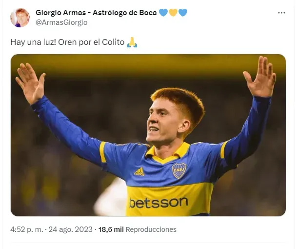 Referido a esta situación, el reconocido astrólogo hincha de Boca, Giorgio Armas, quien en su predicción dijo que podía haber un lesionado en el Xeneize en este encuentro, hizo un posteo en su cuenta de Twitter que ilusionó a todos los fanáticos del conjunto de La Ribera.