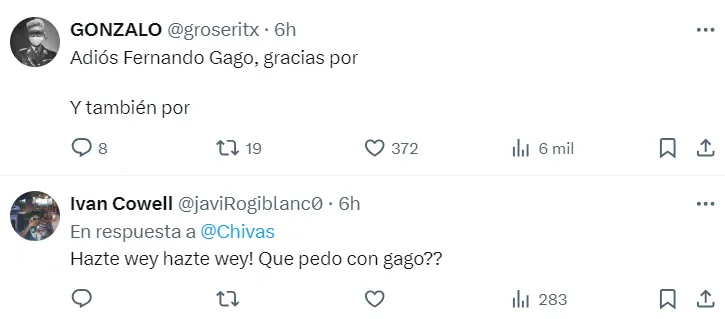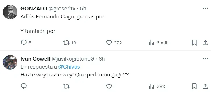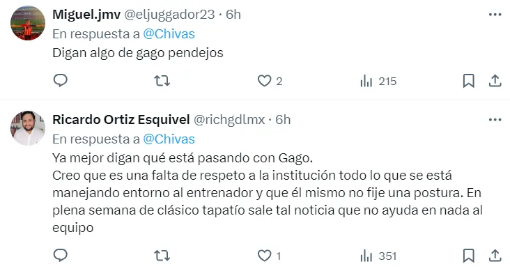 “Digan algo de Gago”, “¿qué está pasando?”, “que se vaya“, fueron algunas de las reacciones de los hinchas de Chivas. Algunos demuestran su preocupación, mientras que otros dejan en claro que les molesta escuchar que su director técnico habla con otra institución.