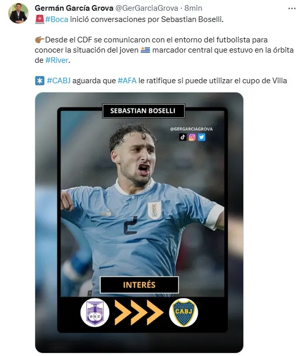 Si bien hubo comunicación directa con el central de Defensor Sporting para conocer su situación deportiva, Grova afirma que Boca espera por la resolución de FIFA por el caso de Sebastián Villa para desvincularlo del club y así liberar un cupo para jugadores extranjeros, lo cual permitiría la inscripción de Sebastián Boselli. Una noticia que sorprendió a todo el fútbol argentino.