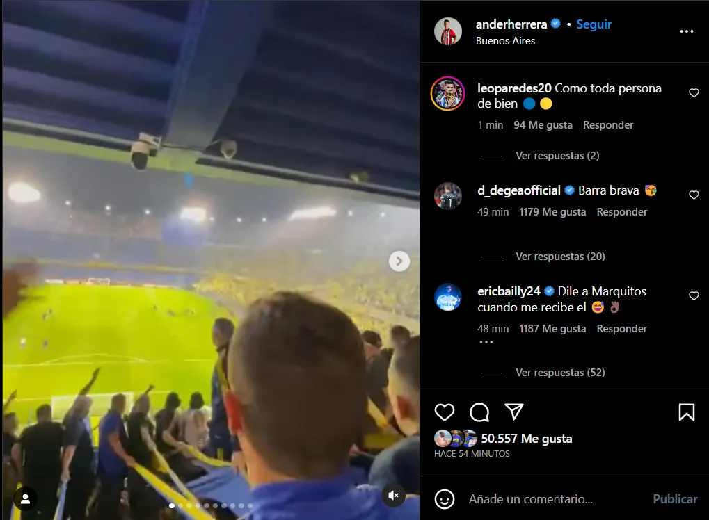 Ander Herrera no solo se dio el gusto de cumplir su sueño de conocer La Bombonera, porque también pudo vivir una gran jornada de Copa Libertadores. Boca ganó, se metió en octavos, el jugador pudo estar un rato en la popular y disfrutar una experiencia completa. Noche ideal para él.