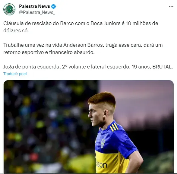“La cláusula de rescisión de Barco con Boca Juniors es de sólo 10 millones de dólares. Trabaja una vez en la vida para Anderson Barros, trae a este tipo, te dará un retorno deportivo y económico absurdo .Juega de banda izquierda, volante 2º y lateral izquierdo, 19 años, BRUTAL”, fue el posteo del medio brasileño junto a una foto del juvenil de Boca.