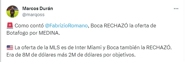 Cabe destacar que Inter Miami no es el único equipo que se encuentra en negociaciones por Cristian Medina, ya que también Botafogo de Brasil viene negociando hace tiempo, y en las últimas horas envió una oferta un poco menor a la de Inter Miami, que era de 7 millones más 2 en objetivos, y que también fue rechazada por el Xeneize.